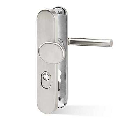Bezpečnostní kování s klikou Tipa s ušlechtilým nerezovým povrchem.