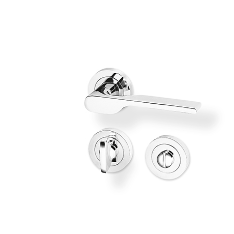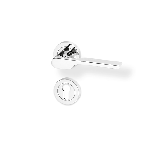 Nový model interiérového kování s chromovým povrchem. Klika spojena s rozetou. Šroubovací kulatá rozeta.