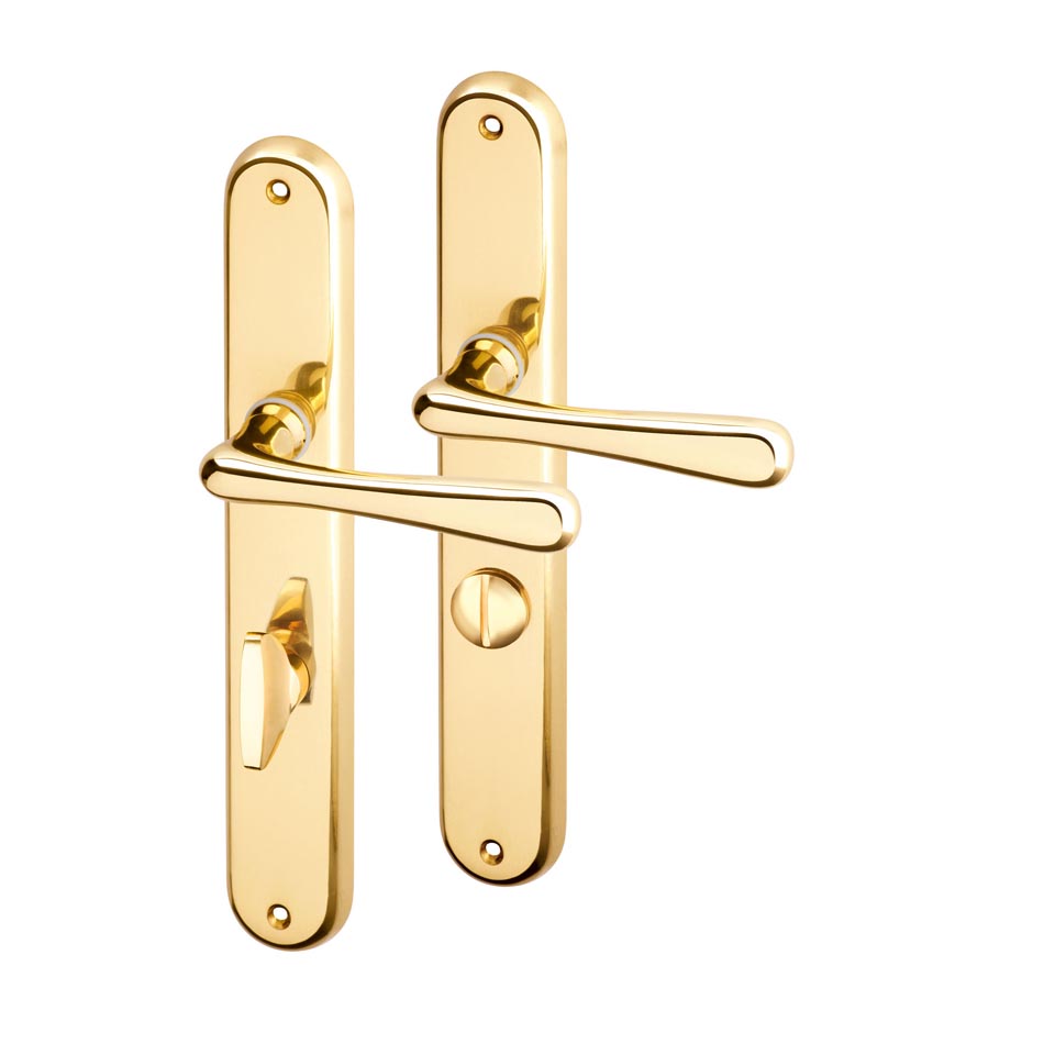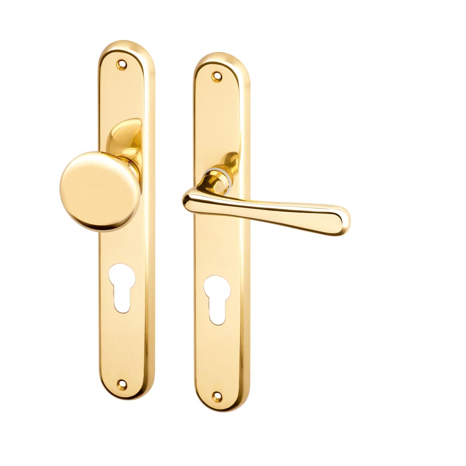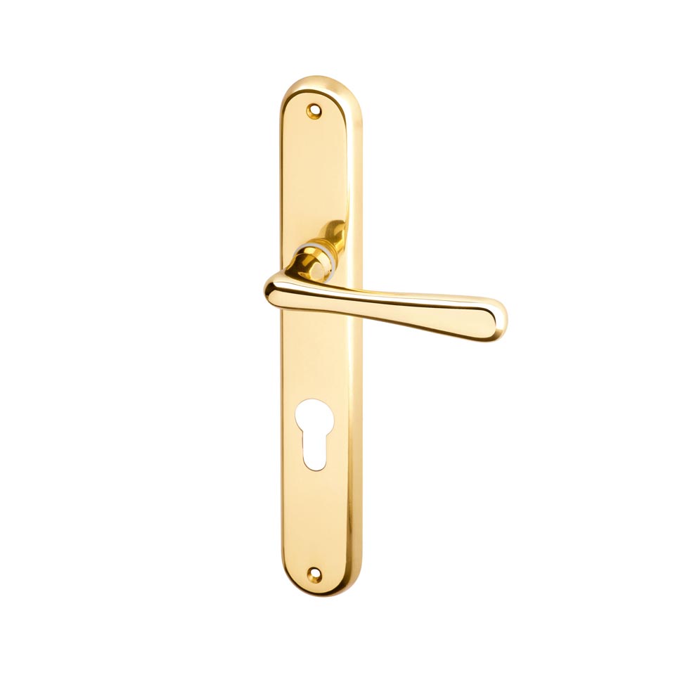 Mosazné kování s plnými klikami, tvarově vhodné například při renovaci historických a dobových interiérů.