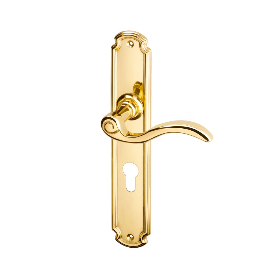Masivní odlévané mosazné kování s ornamentálním štítkem a klikou.