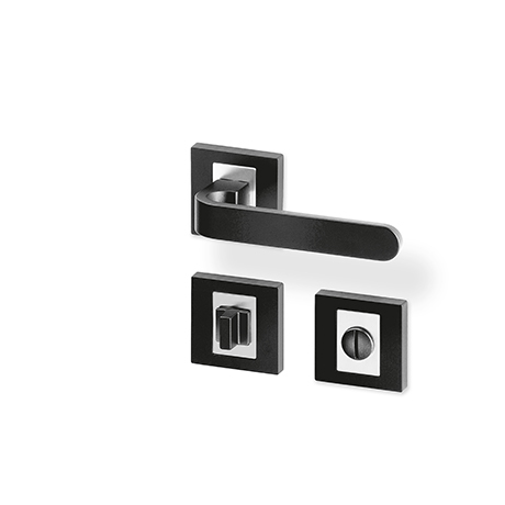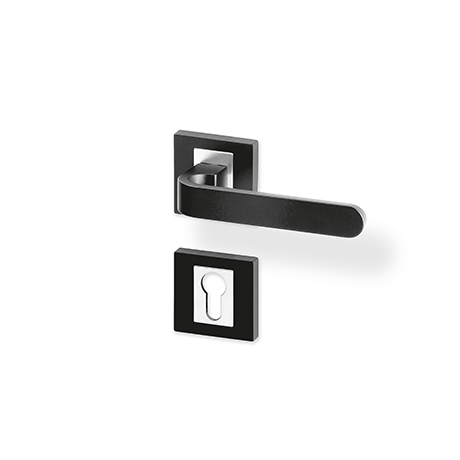 Nový model interiérového kování se zajímavě řešeným tvarem kliky na hranaté rozetě ve více variantách povrchové úpravy. Robustní litá konstrukce rozety s trny proti pootočení. Povrch: černý lak / efekt nerez