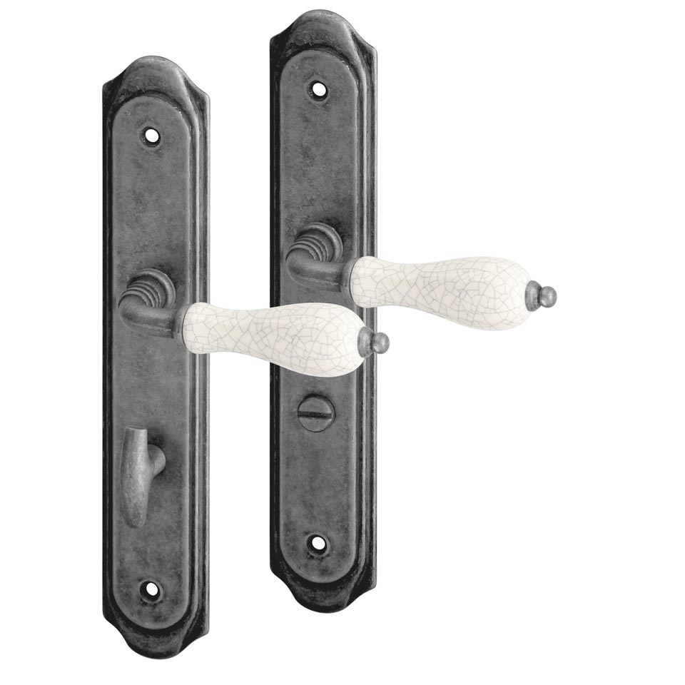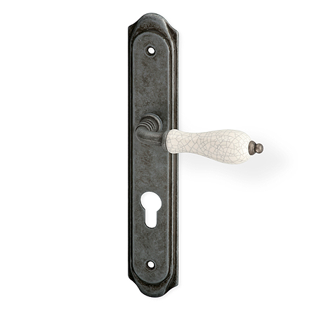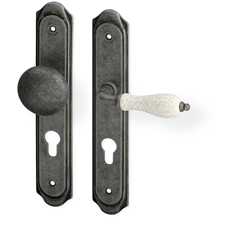 Rustikální kování s patinovanou povrchovou úpravou doplněné porcelánovým madélkem. Pro tento typ povrchu platí, že díky ručnímu opracování má každý kus svou specifickou kresbu a každý kus je tak svým způsobem originálem. Materiál: šedá patina / porcelán