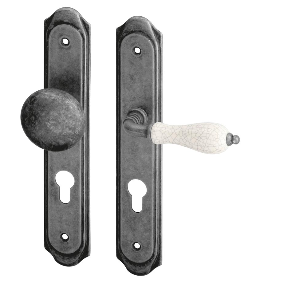Rustikální kování s patinovanou povrchovou úpravou doplněné porcelánovým madélkem. Pro tento typ povrchu platí, že díky ručnímu opracování má každý kus svou specifickou kresbu a každý kus je tak svým způsobem originálem. Materiál: šedá patina / porcelán