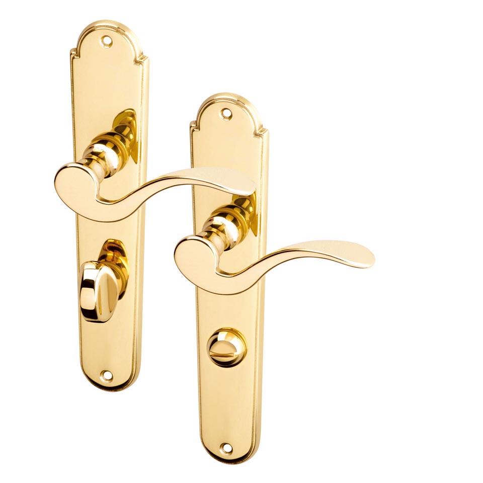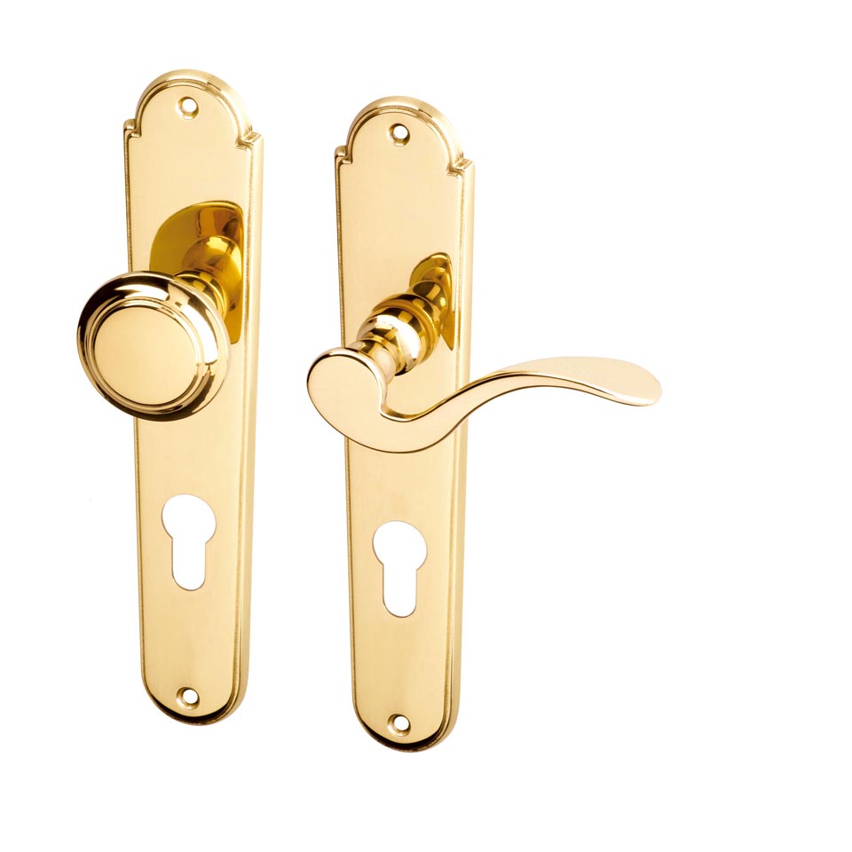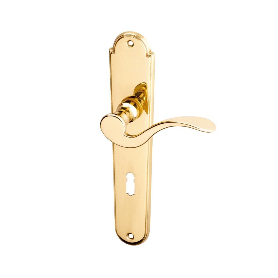 Štítové kování mosazné s tvarovaným štítem a klikou.