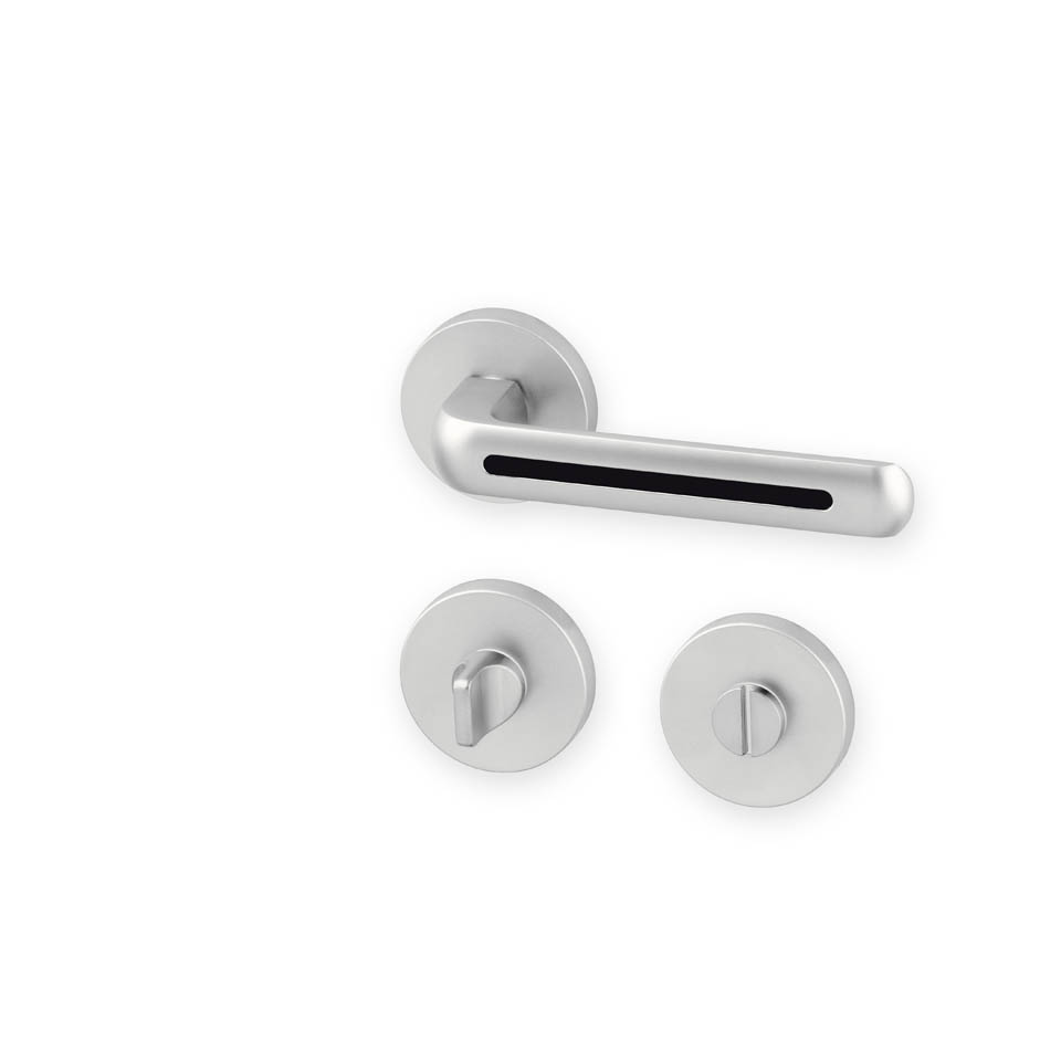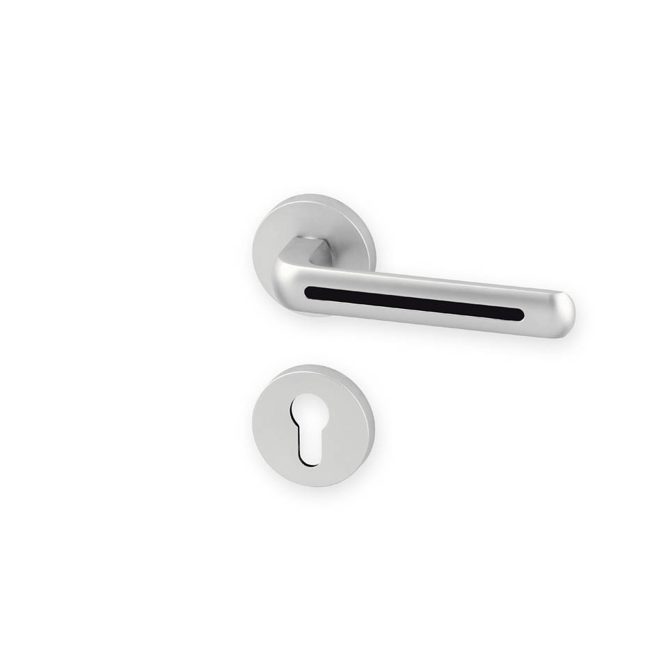 Vybírat můžete ze dvou povrchových úprav, dvou barev linky a dvou tvarů rozet. Díky kovové konstrukci je kování vhodné i do interiérů se střední zátěží, jako jsou např. kanceláře.