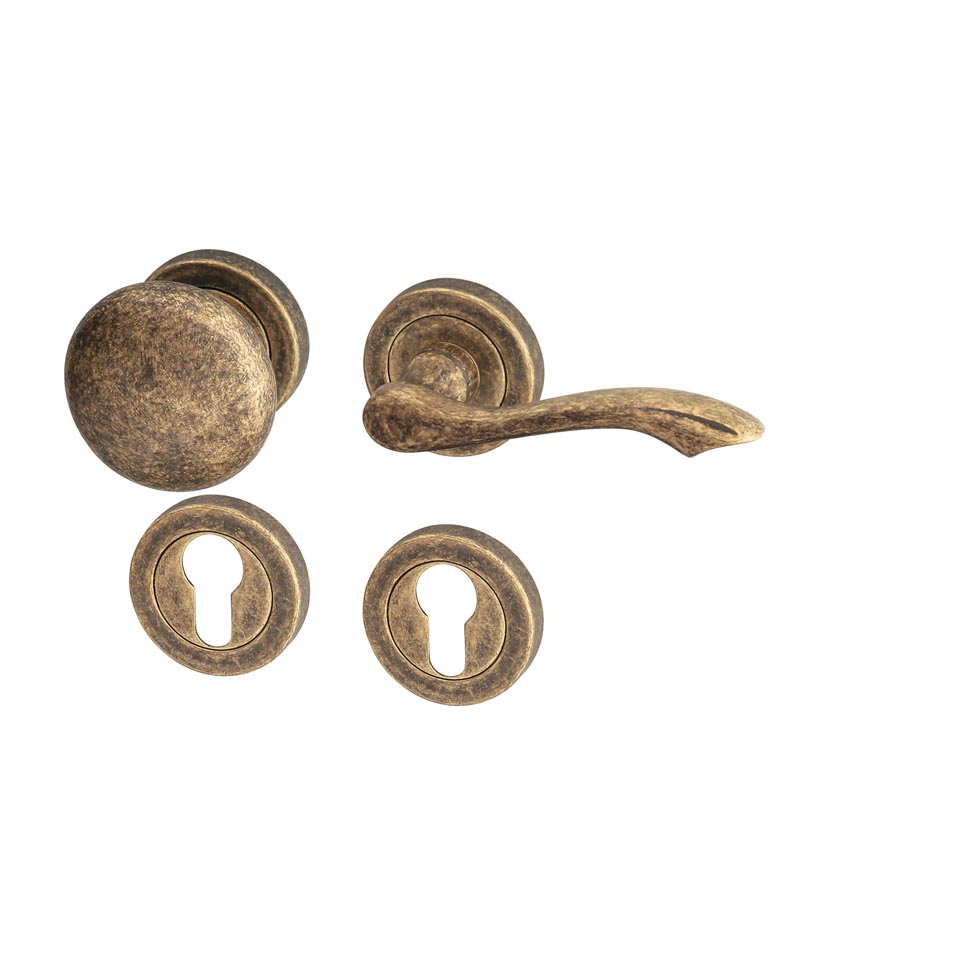 Rustikální kování s patinovanou povrchovou úpravou. Pro tento typ povrchu platí, že díky ručnímu opracování má každý kus svou specifickou kresbu a každý kus je tak svým způsobem originálem. Materiál: patina bronz matná.