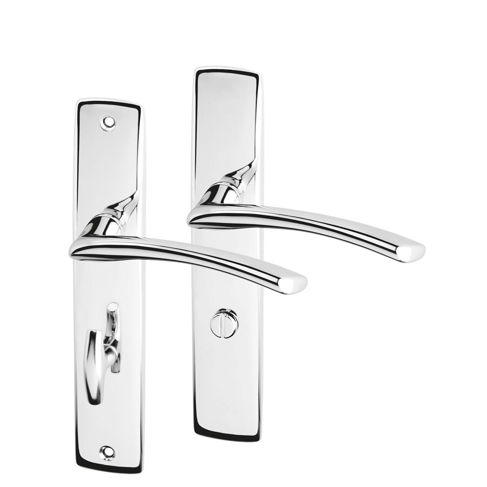 Chromové štítové kování se zajímavým designem krycího štítku.