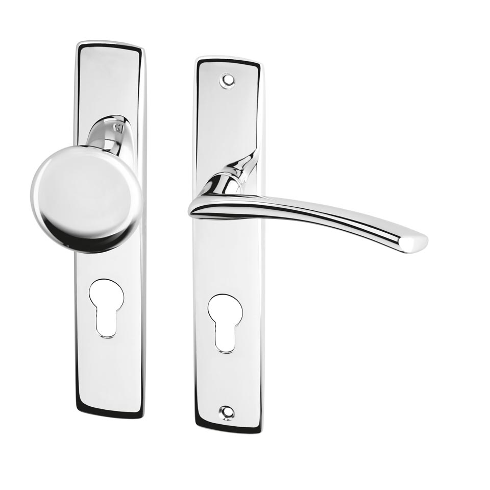 Chromové štítové kování se zajímavým designem krycího štítku.