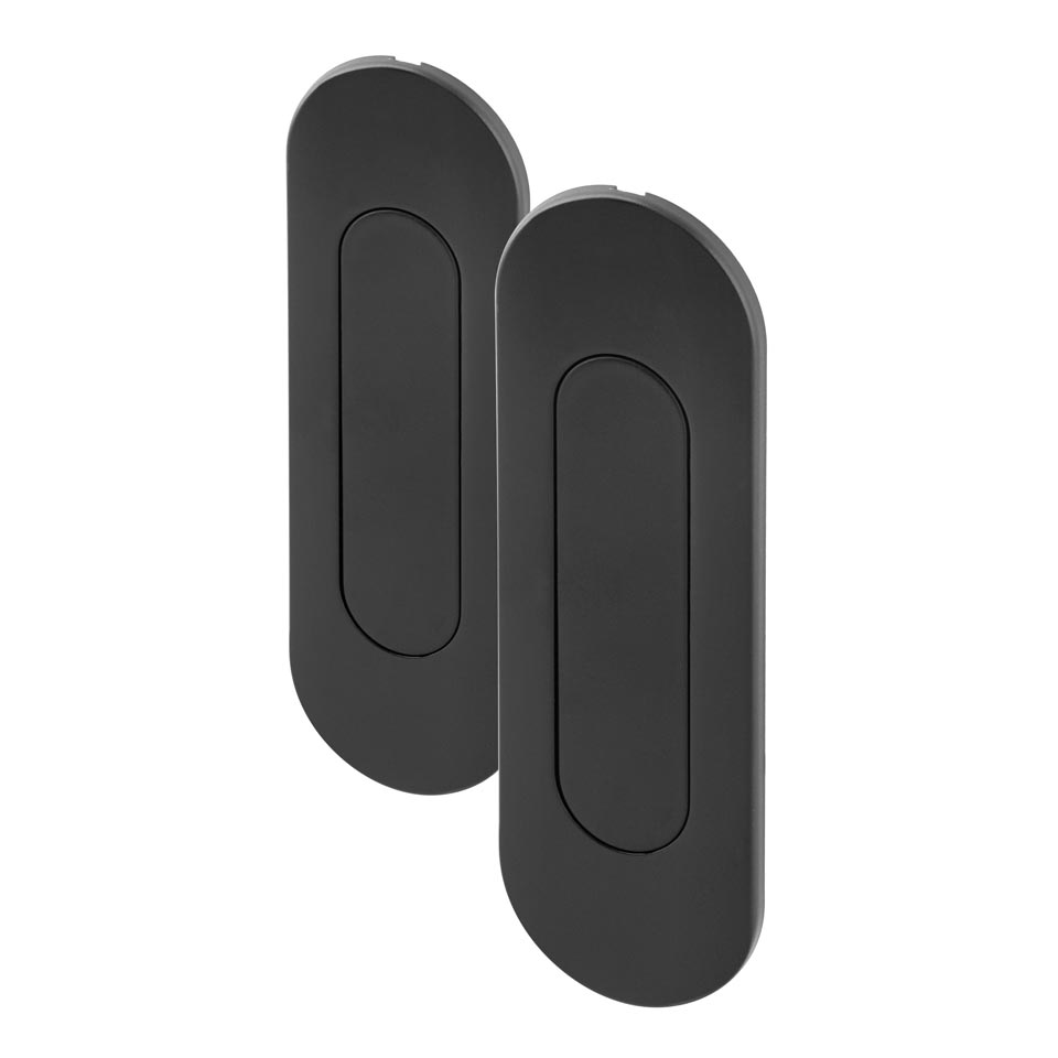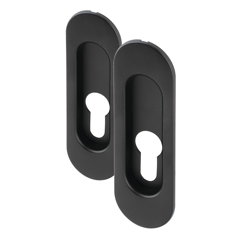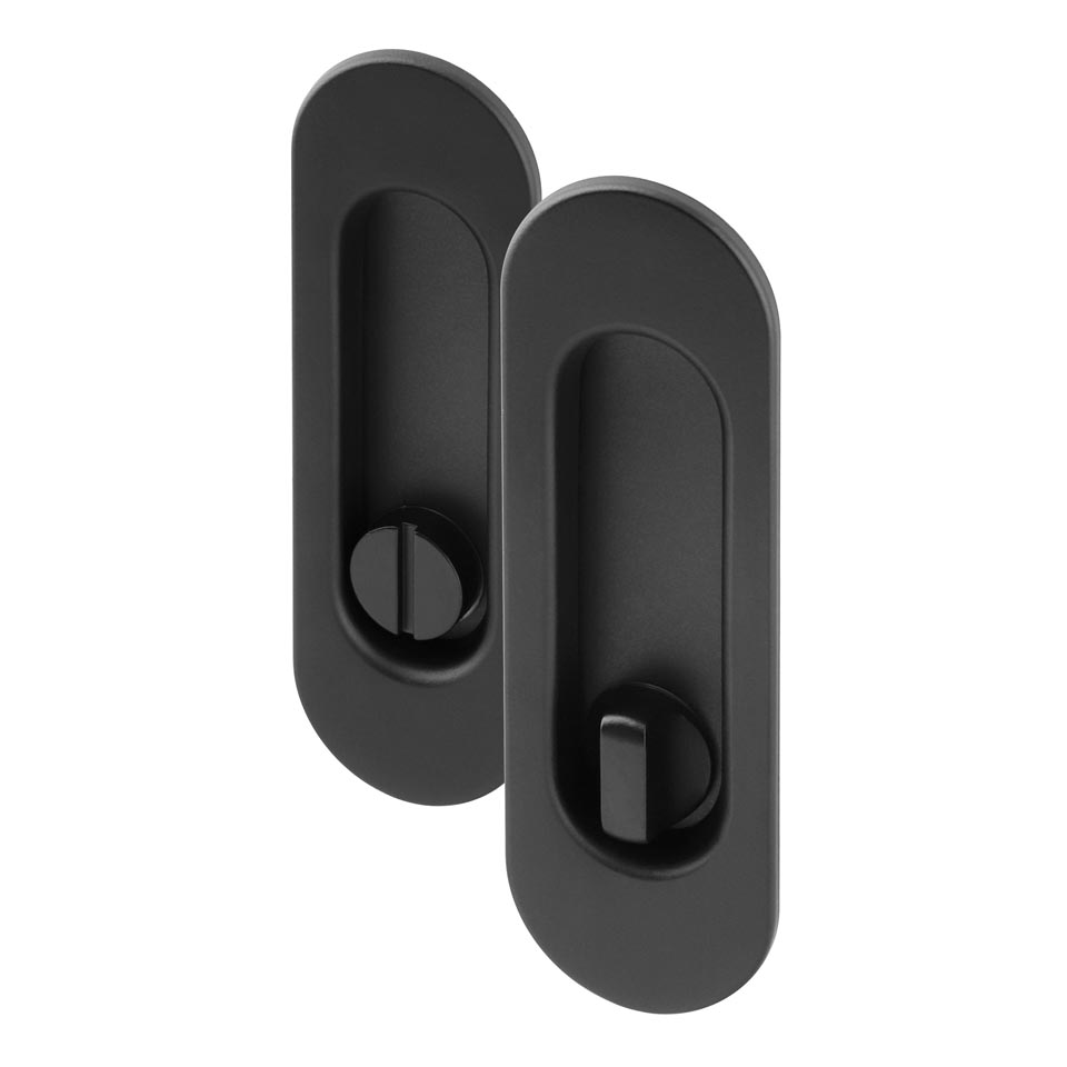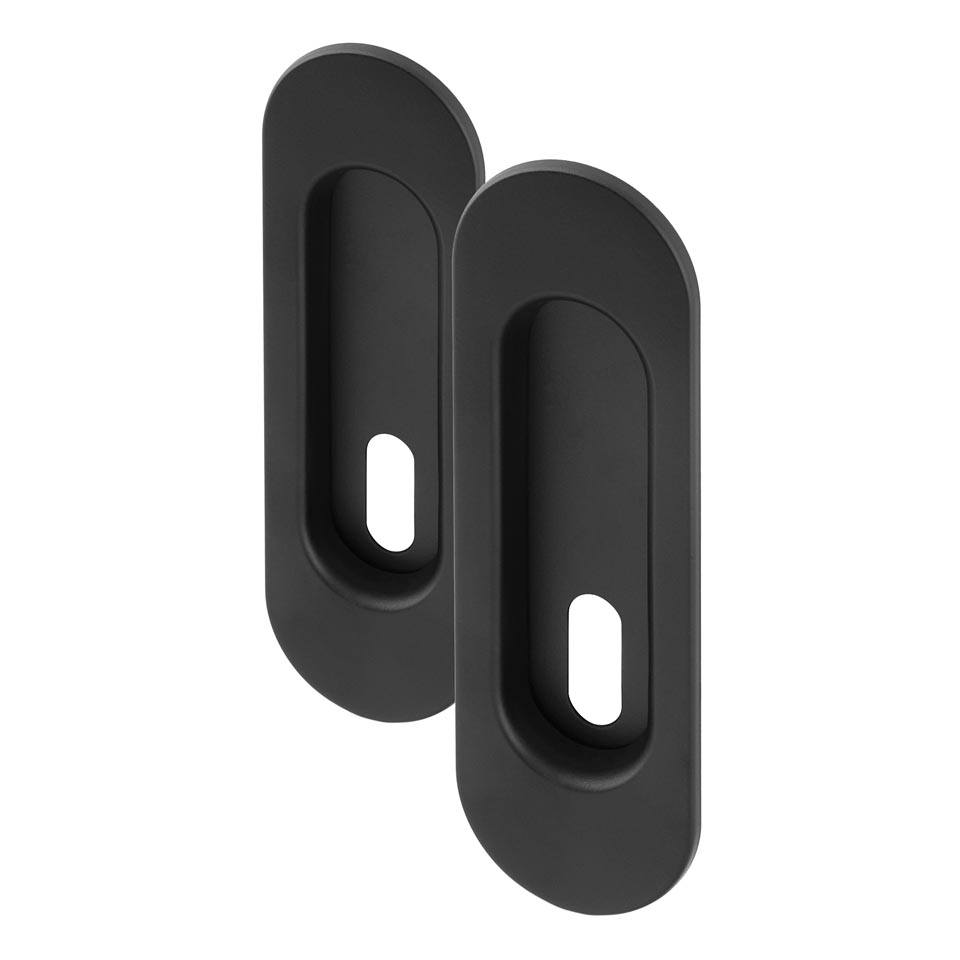 Kvalitní úchyty z kovu pro montáž a ovládání posuvných interiérových dveří. Moderní design oválných mušlí s povrchovou úpravou černý lak, snadná montáž a široká škála provedení zajistí vašim dveřím příjemné ovládání a elegantní vzhled. Dodáváme ve variantách pro dózický (pokojový klíč), cylindický (vložkový klíč) nebo s WC kličkou. Dále v provedení bez otvoru a se skrytým úchytem