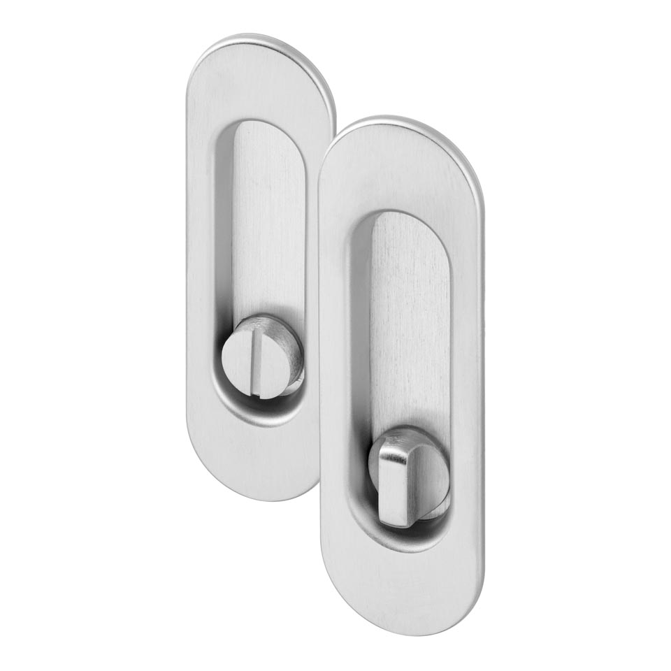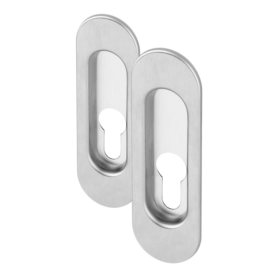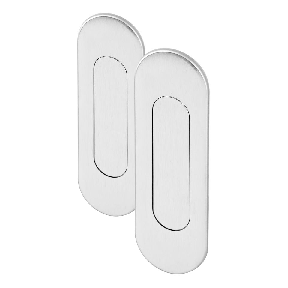 Kvalitní úchyty z kovu pro montáž a ovládání posuvných interiérových dveří. Moderní design oválných mušlí s povrchovou úpravou matný chrom, snadná montáž a široká škála provedení zajistí vašim dveřím příjemné ovládání a elegantní vzhled. Dodáváme ve variantách pro dózický (pokojový klíč), cylindický (vložkový klíč) nebo s WC kličkou. Dále v provedení bez otvoru a se skrytým úchytem