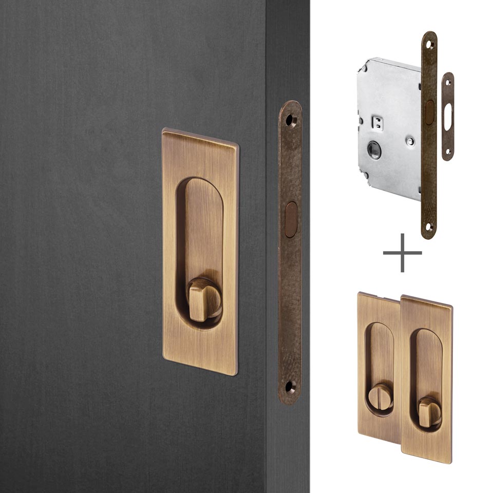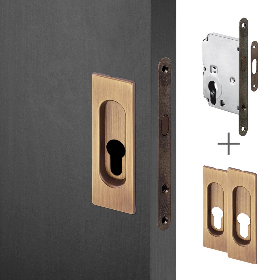 Komplet obsahuje mušle, zadlabací zámek, rámový protikus, klíček, náprstek a spojovací materiál
