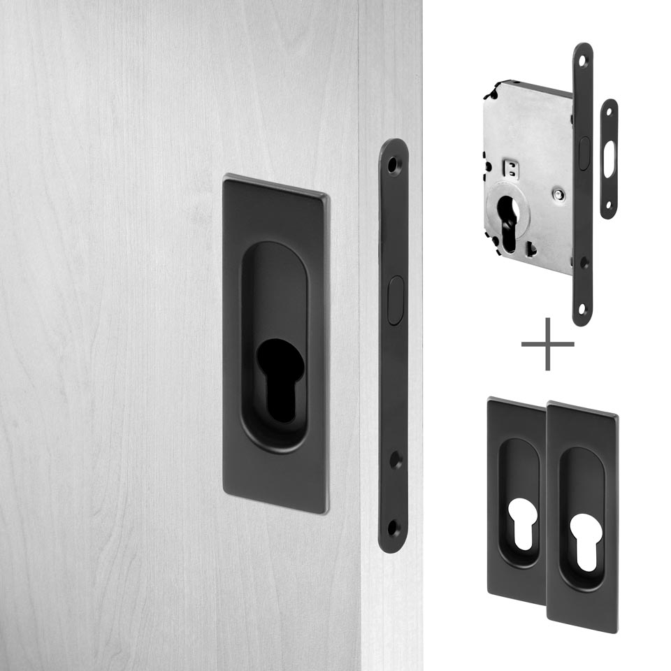 Komplet obsahuje mušle, zadlabací zámek, rámový protikus, klíček, náprstek a spojovací materiál