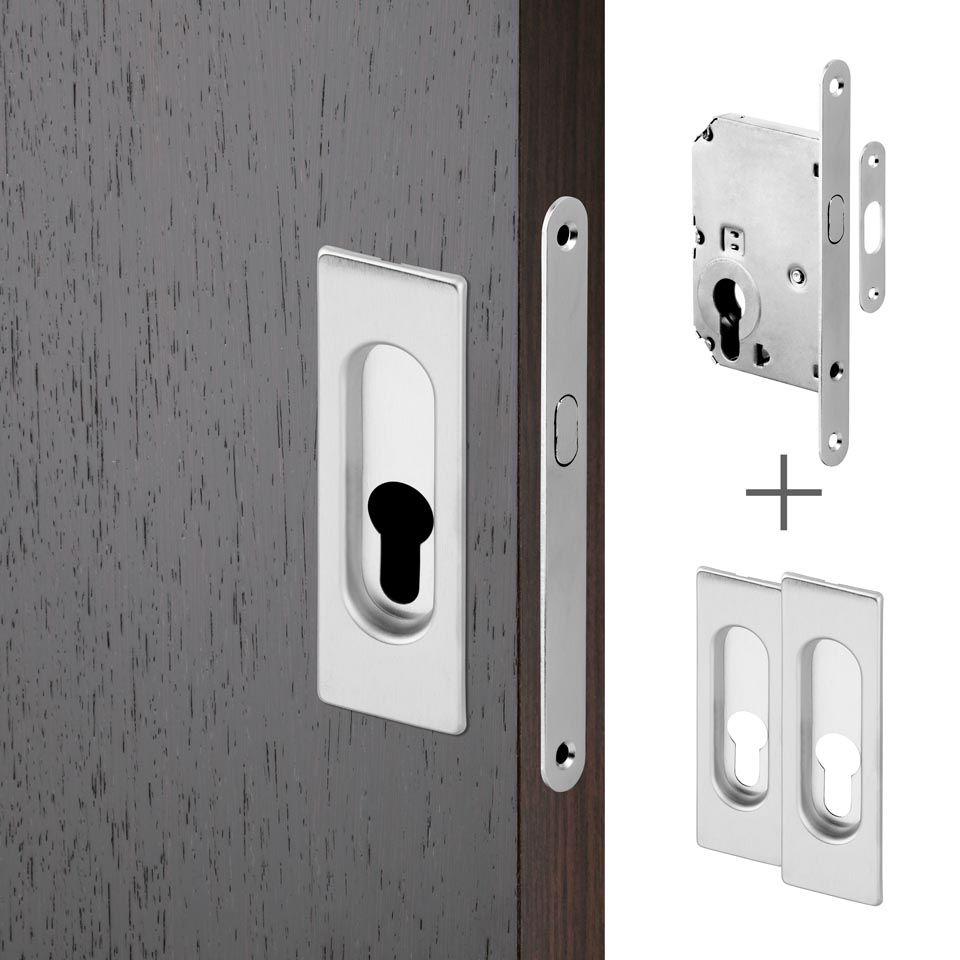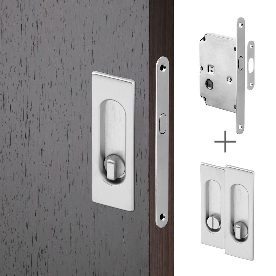 Výhodná sada dvou úchytů a zadlabacího zámku pro posuvné dveře. Dostupné v široké škále barevných provedení. Varianty s WC kličkou, obyčejným klíčem nebo stavební vložkou - fabkou.