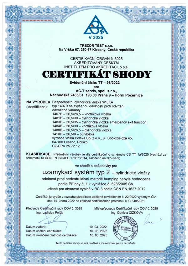 Wilka 1400A - cilindrické vložky ČSN EN 1627:2022 Bezpečnostní třída RC3 |