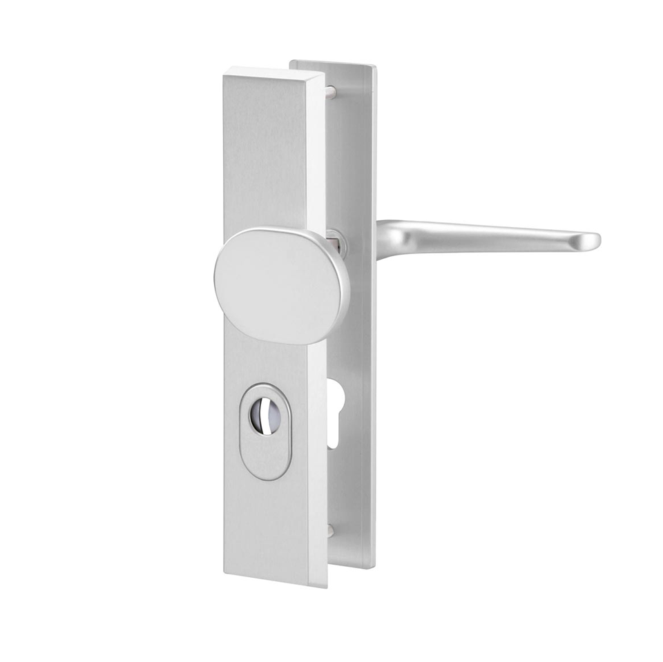Bezpečnostní kování s klikou Tipa s ušlechtilým nerezovým povrchem.